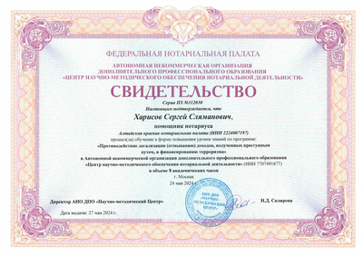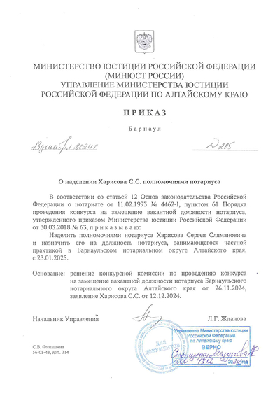 Приказ Управления Министерства юстиции Алтайского края "О наделении Харисова С.С. полномочиями нотариуса" № Д265 от 13 декабря 2024 года