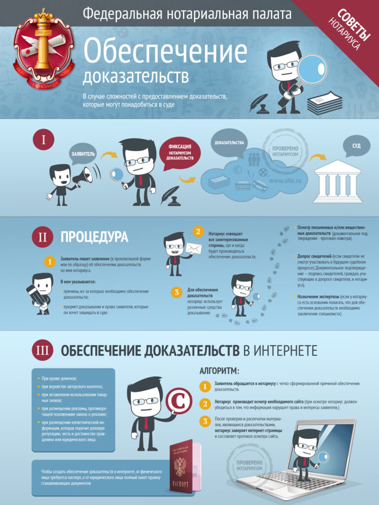 Если у вас есть опасения, что в будущем вам будет затруднительно или невозможно предоставить доказательства, которые вам могут понадобиться, например, в суде, или другом административном органе, вы можете обратиться за помощью к нотариусу. По вашей просьбе он сохранит и зафиксирует данные доказательства. Данная процедура называется — обеспечение доказательств.